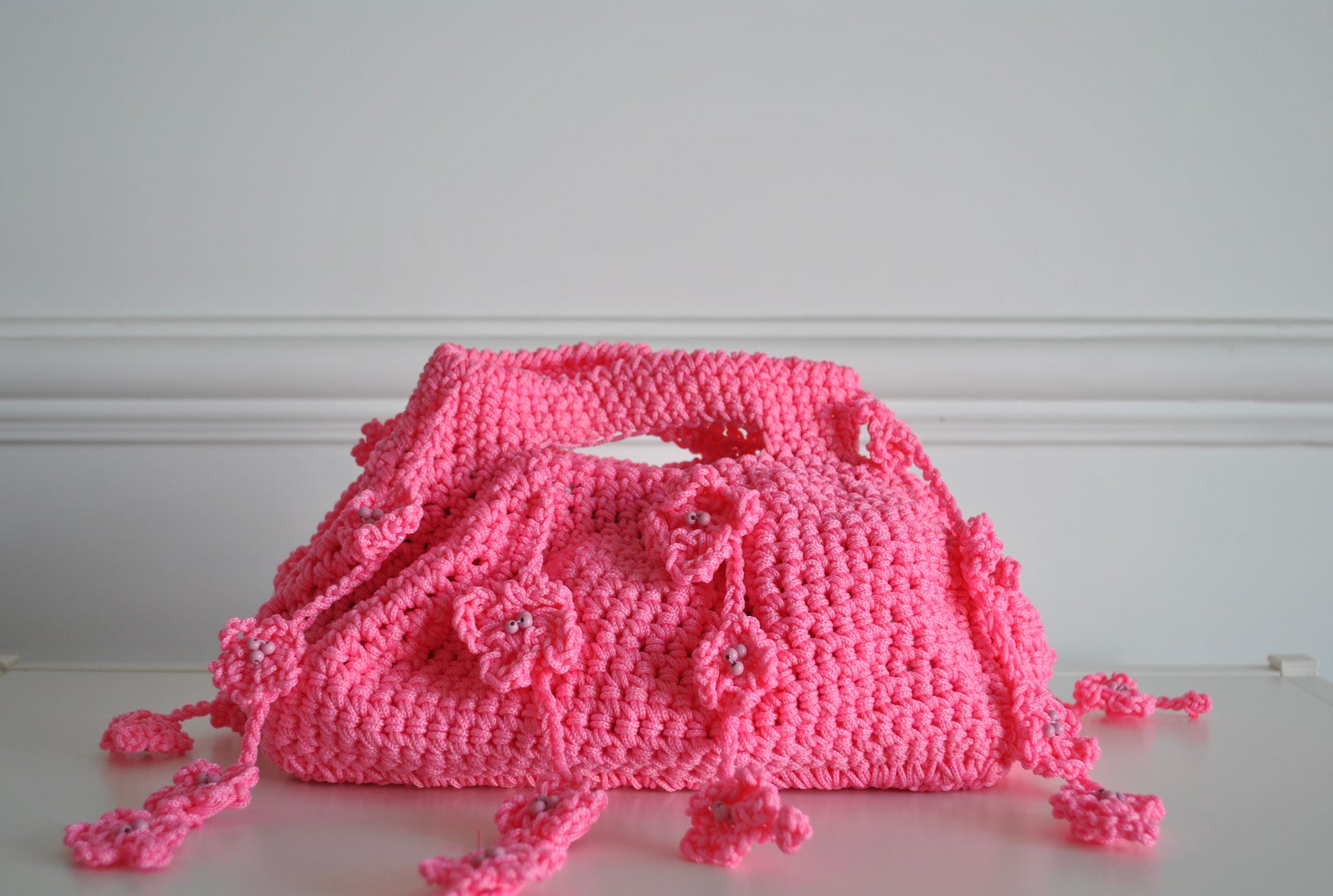 La borsa FAIRY PINK in rosa con fiori crochet e perline, è letteralmente fatta per rubare la scena (e qualche sguardo curioso).